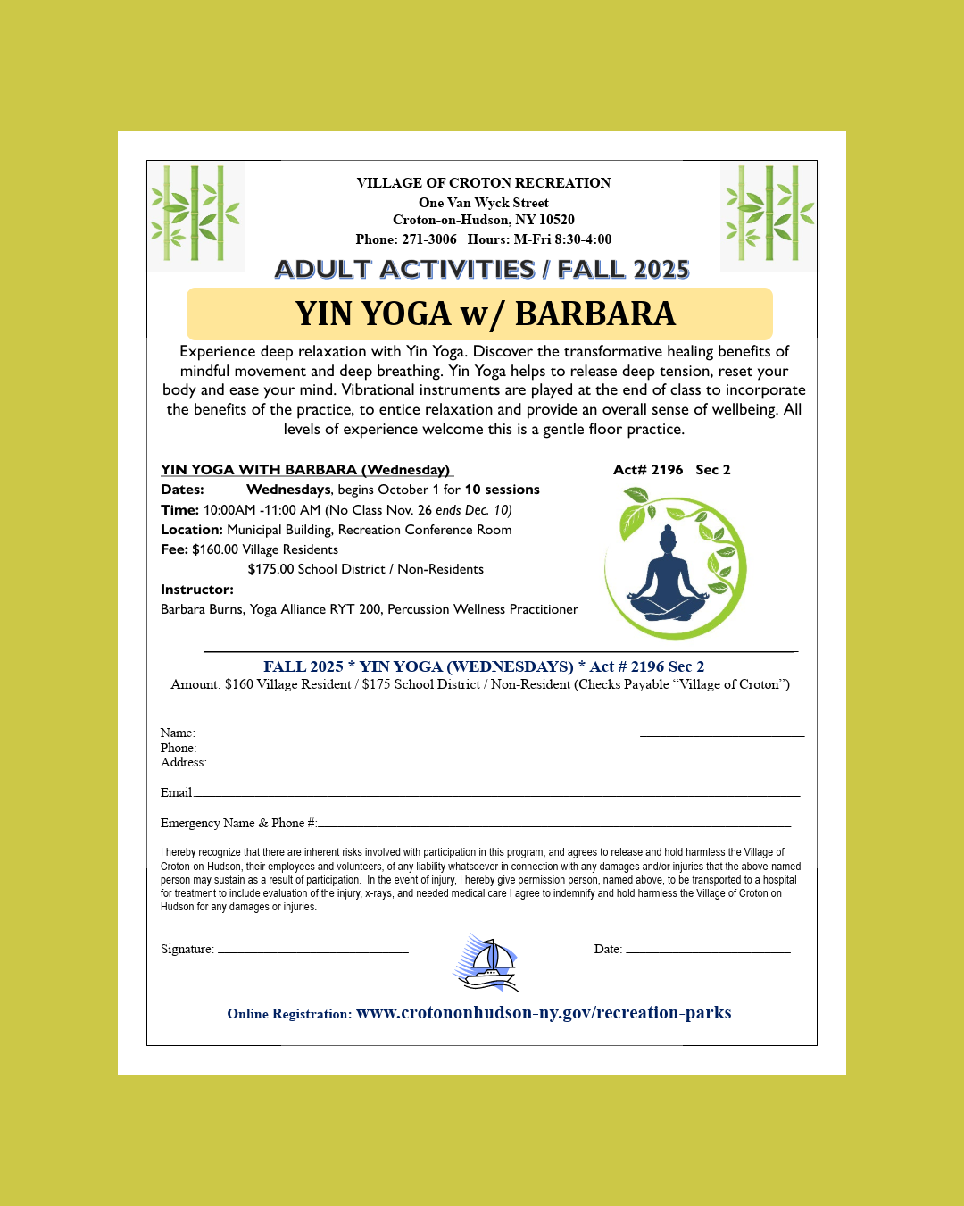 This offering is through the Village of Croton Recreation Department! Join us Wednesdays at 10 am for a traditional Yin Yoga practice. Register directly with Village of Croton Rec. department to reserve your spot in this peaceful yet challenging class. Space is limited!